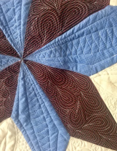 Un quilt que j’ai réalisé pour ma belle-maman. Après 65 ans de vie commune, elle était heureuse de retrouver un peu de son compagnon de toute une vie, de s’envelopper dans cet ouvrage cousu à partir de ses chemises et cravates.